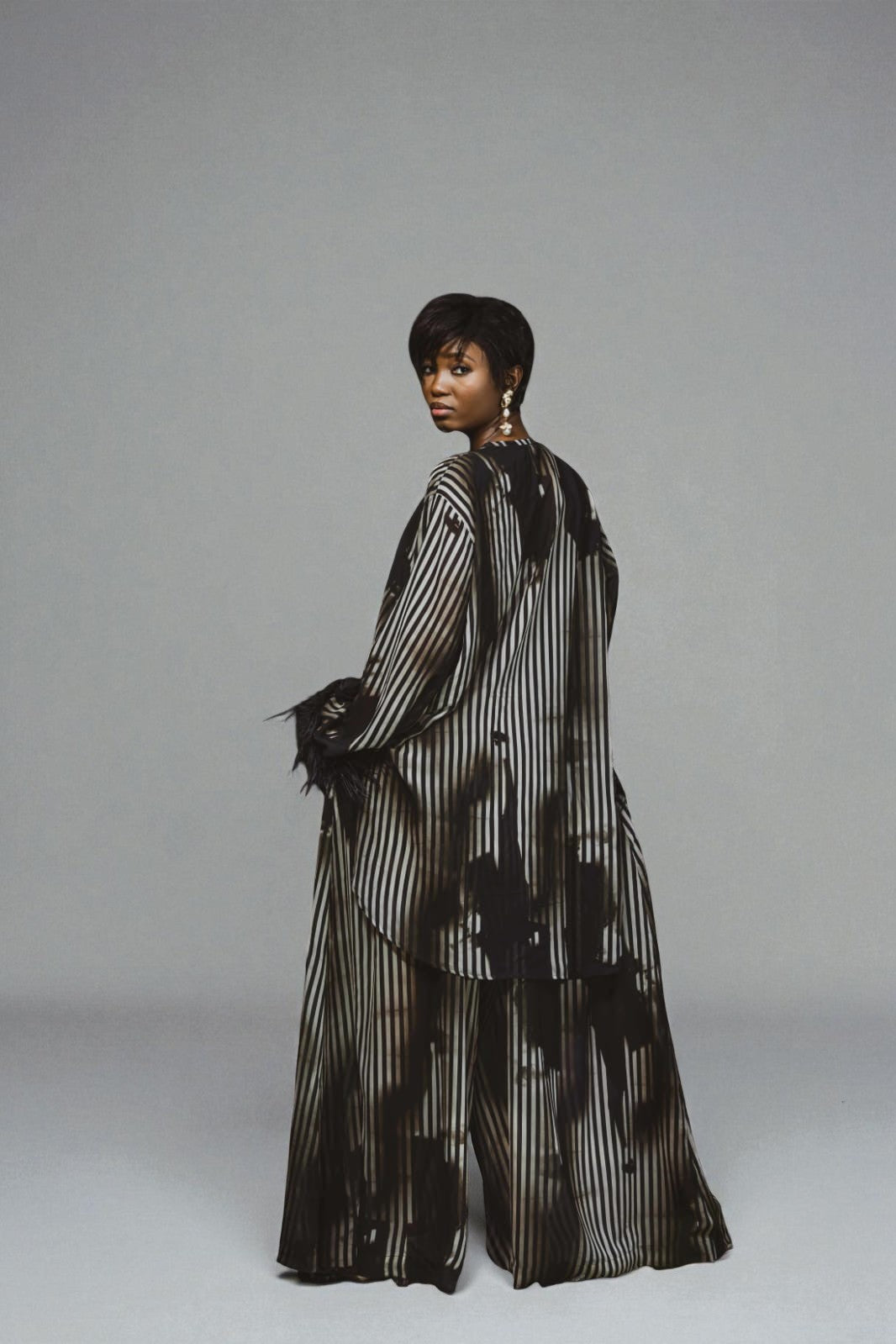Ensemble tunique manche longue avec les détails en plumes et pantalon à jambes larges.