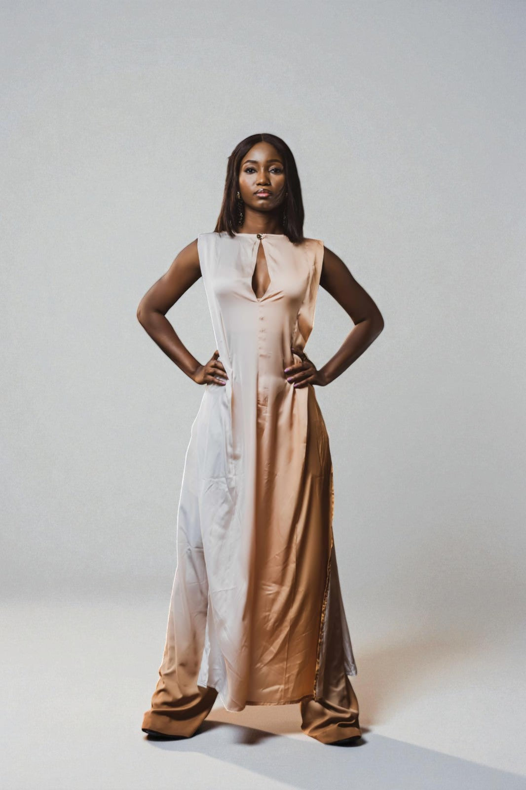 Ensemble satiné, tunique longue fendue